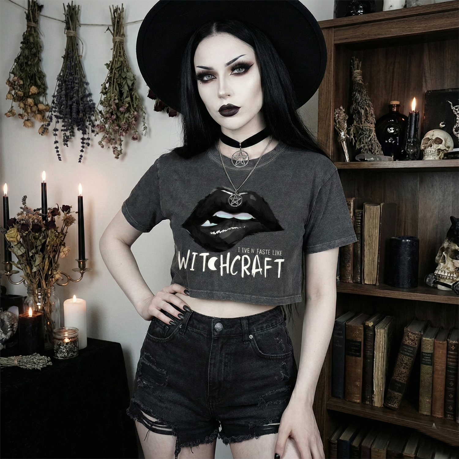 Command attention with our Snow Washed Crop Top—a dark, rebellious staple designed for those who embrace alternative aesthetics.