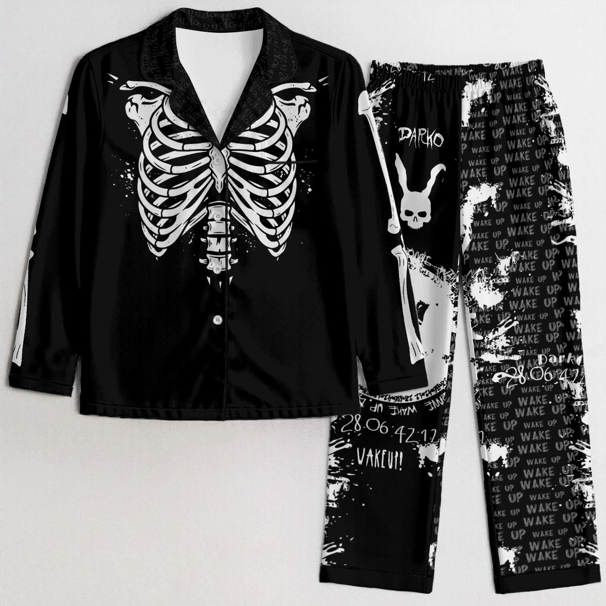 Slip into dark elegance with this satin-inspired pajama set that drapes like liquid shadow against your skin. The structured lapel top showcases a chest pocket for an edgy, tailored look, while the straight-cut pants feature dual side pockets for practical edge. Contrast piping traces the seams with moody sophistication, while the non-stretch fabric creates a deliberately relaxed, undone silhouette that channels effortless gothic style.