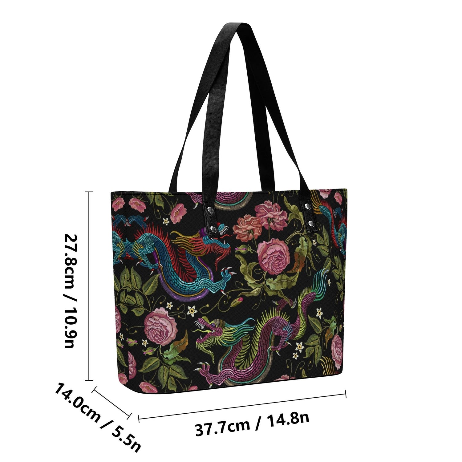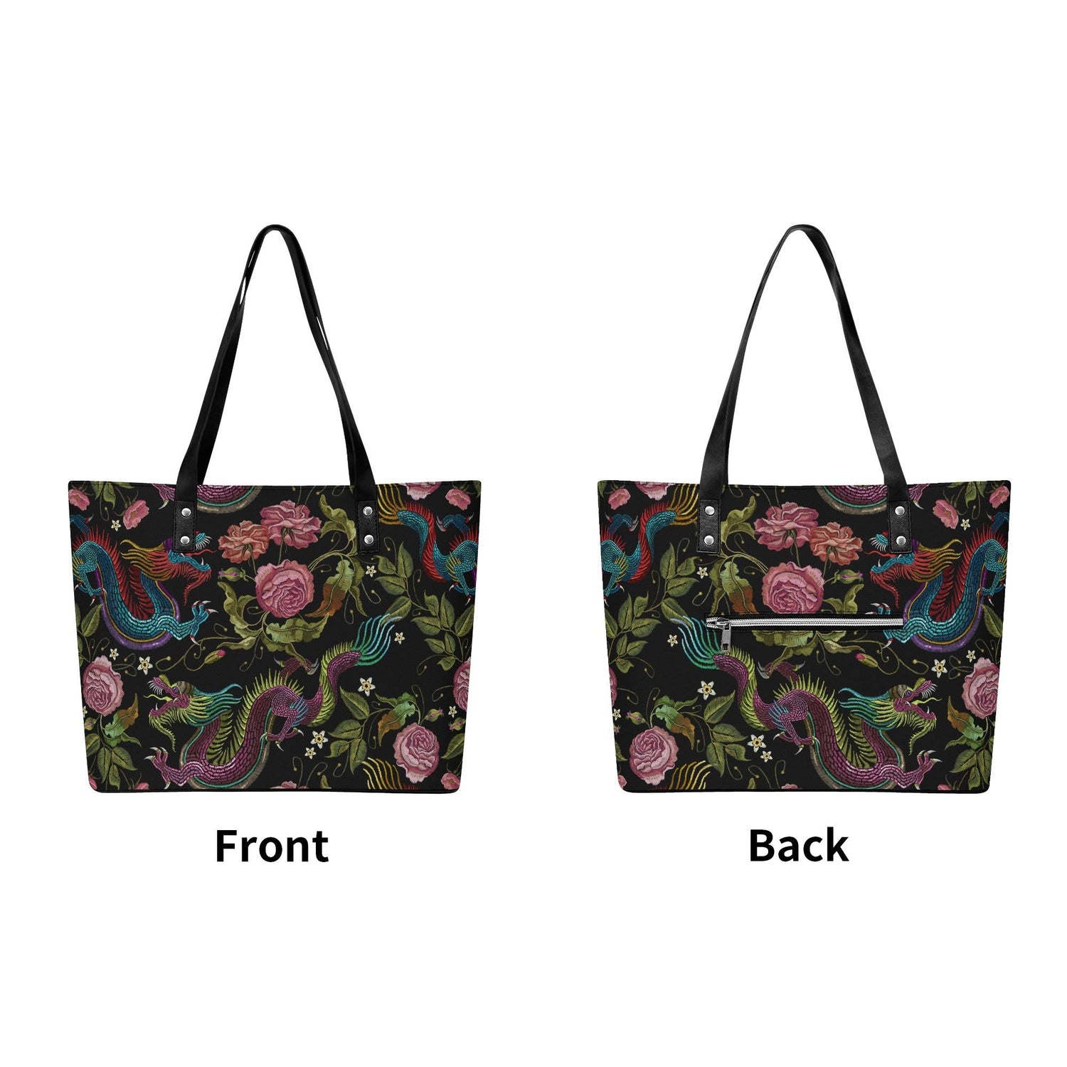 Dragons & Flowers Leather Tote Bag with Back Zipper Pocket